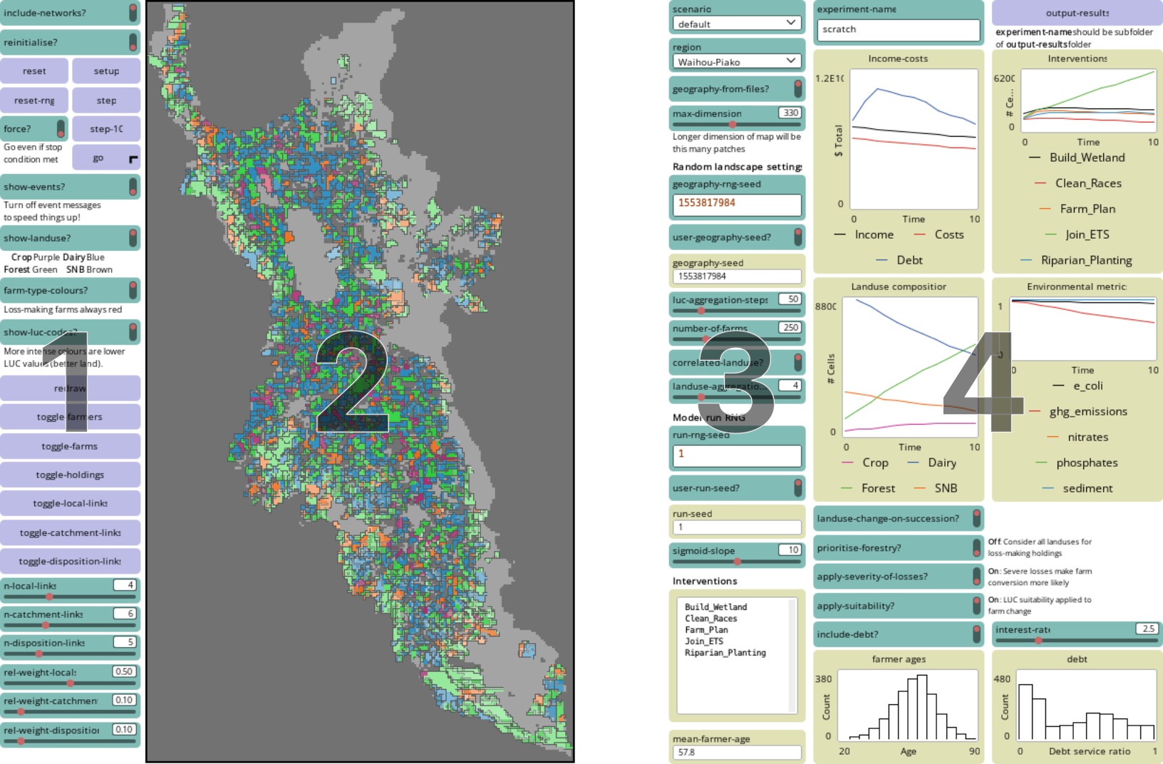 The column of controls on the right of the model provides some tracking plots (overall income and costs, overall land on which different interventions have been adopted, overall land in different land uses, aggregate environmental impacts, age and debt profiles of farmers), and also some high level controls as follows: